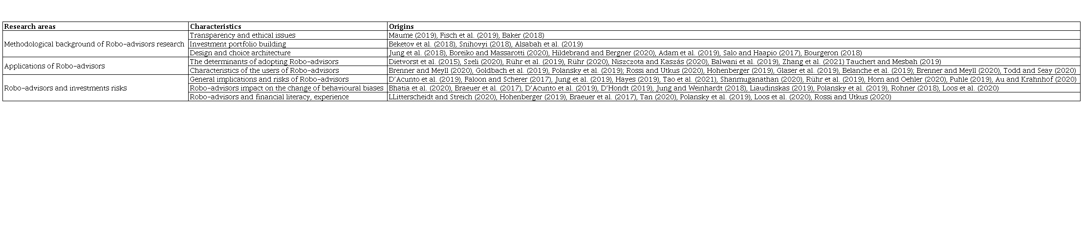 The typology of key research areas on Robo-advisors in investments and their characteristics is presented in Table 2.