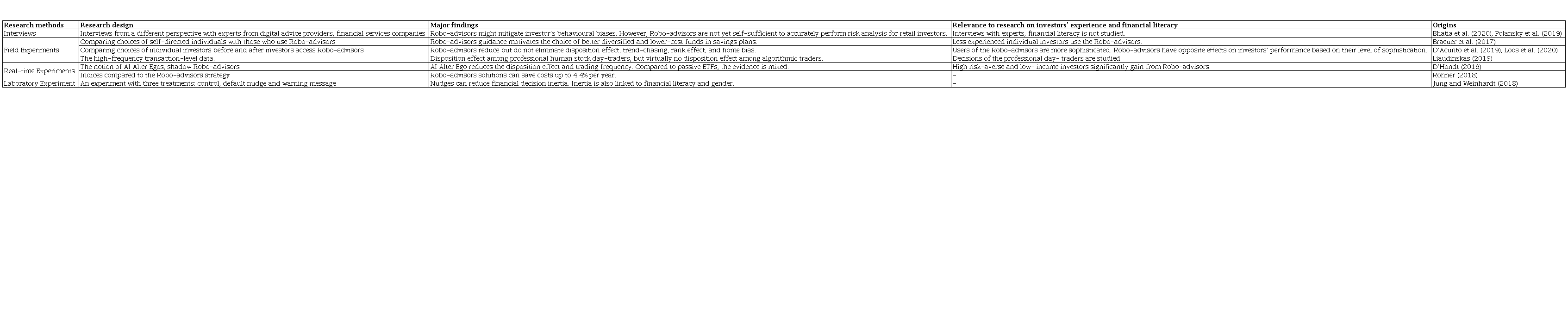 We have selected for a detailed review several studies that represent typical research methods used to examine links between Robo-advisors and behavioural biases: real-time experiments, qualitative studies and a laboratory experiment. The selected studies are summarised in Table 3.
