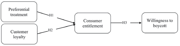 According to the SET rank equilibrium norm (Cropanzano & Mitchell, 2005), special treatment from a retailer can trigger an ego-focused and self-centered attitude that leads to CE (Wetzel et al., 2014). Customers who display entitlement and are driven by belief in their deservingness may demand extremely high benefits and rewards (Edey & Knight, 2018). Moreover, a rising sense of entitlement to better treatment from the retailer has boosted customer retaliatory intentions (Davis, 2019), such as willingness to boycott.
