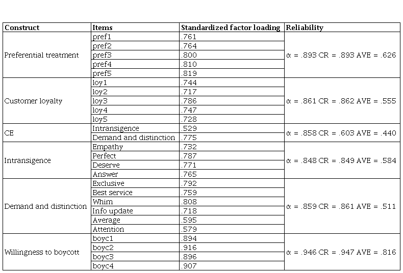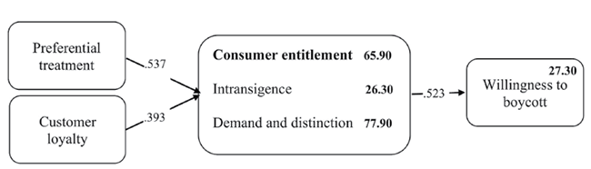 As presented in Figure 2, 65.90% of the variance in CE is explained by preferential treatment and customer loyalty (CE is explained by 26.30% of the variance in intransigence, and 77.90% of the variance in demand and distinction). In addition, 27.30% of the variance in willingness to boycott is explained by CE and is in the acceptable range (R2 > .25; see Nunnally & Bernstein, 1994).