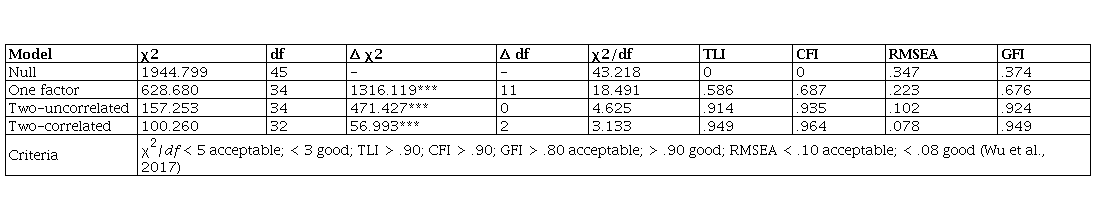 Next, the two-factor structure of EFA in the previous stage was rigorously tested and validated by conducting CFA with another independent sample, using AMOS 24. The results of the fit indices indicated a good model fit (χ. = 100.260; df = 32; χ./df = 3.133; TLI = .949; CFI = .964; RMSEA = .078; GFI = .949; Table 8) and supported the two-factor model (Hair et al., 2010).