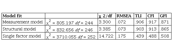 The data are normally distributed and appropriate for SEM estimation, as the skewness values ranged from -.481 to .169 and the kurtosis values ranged from -.809 to .132 within the recommended range of 3 and 8, respectively (Kline, 2011). The study followed the two-step procedure recommended by Anderson and Gerbing (1988): first, the authors conducted CFA to access the construct validity and reliability in the measurement model; then, the structural model was accessed and used to test the hypotheses.