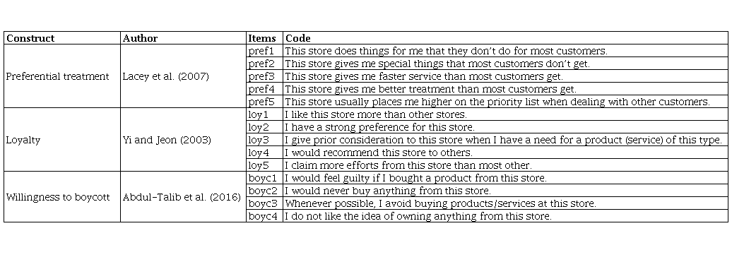 The authors employed the covariance-based SEM to perform nomological validation and model testing (Chen et al., 2014) of the extended CEI. All scales in Study 4, including Yi and Jeon’s (2003) 5-item consumer loyalty scale, Lacey et al.’s (2007) 5-item measure of preferential treatment, and Abdul-Talib et al.’s (2016) 4-item willingness to boycott measure, were also verified and slightly modified to fit the research context (see Table A1 in the Appendix). Abdul-Talib et al.’s (2016) willingness to boycott measure was tested in China, which has a Confucian culture, and used in Malaysia, which is a multi-religion, multi-cultural country (Abdul-Latif & Abdul-Talib, 2017). All measures were captured using a 5-point Likert scale.