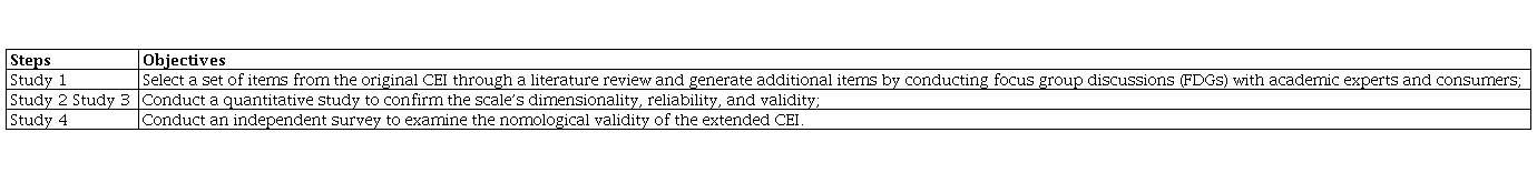 To develop the original CEI into a better fitting measurement of CE in the context of Vietnam’s retail sector, four studies were conducted, as presented in Table 1, following Churchill (1979) and Devellis’s (2003) suggestions. While some original CEI items were retained, others were screened against the culture, new complementary items were added, and unsuitable items were removed without changing the construct’s domain (Abdul-Latif & Abdul-Talib, 2017).