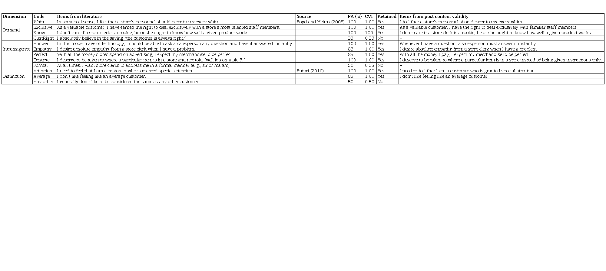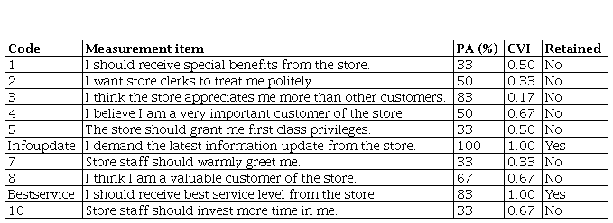 Entitled consumers enter a retail store expecting to receive special treatment from the staff and automatic compliance with all their requests (Boyd & Helms, 2005). Along with personality traits, other antecedents, such as increasing competitiveness and consumers’ power over sellers, are likely to contribute to the growth of CE. For instance, given the increasingly intense competition in the service and retail industries, customers in such industries possess relatively high market power, and this can transfer into CE (Ma et al., 2018). In addition, in a competitive environment, prioritization tactics give customers a sense of superiority, and they feel that they deserve special treatment from the company; this eventually develops into entitlement behaviors, such as tough negotiations, the use of bargaining tactics, and attempts to obtain privileges (Ma et al., 2018; Wetzel et al., 2014). Vietnam is a special case, as it is transitional, consumers are dependent on the government for many things (Le et al., 2020), and customers exhibit the uncertainty avoidance tendency (Diallo & Seck, 2018). As uncertainty avoiders, customers require strict regulation and rule adherence to reduce uncertainty (Hoffmann, 2014). Customers in the developing market also demand a high degree of transparency from service companies (Liu et al., 2015) in order to reduce transactional risk. Thus, the CEI needs to be enriched with items that reflect the demand for information updates. According to Diallo and Seck (2018), consumers’ service quality expectations vary due to cultural differences. Given the entitled customer’s sense of superiority, the service level must be commensurate with their relative standing (Wetzel et al., 2014). Thus, the scale also needs to be enriched with items that reflect the demand for the best quality.