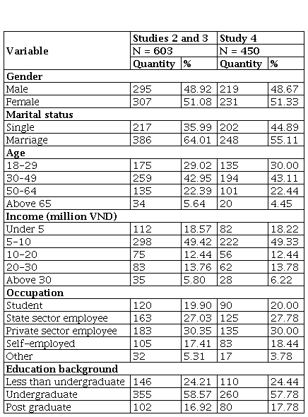 As shown in Table 4, the samples for Studies 2 and 3 consisted of 48.92% male and 51.08% female respondents. In terms of age, Studies 2 and 3 included respondents 18–29 years of age (29.02%), 30–49 years of age (42.95%), and 50 years of age and older (28.03%). According to Das (2018), more than half of the city’s residents had an average monthly income between VND 5.7 million and VND 11.37 million (i. e., USD 250–500). Thus, 49.42% of the participants in Studies 2 and 3 had a monthly income between VND 5 million and VND 10 million.