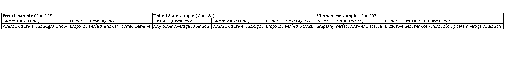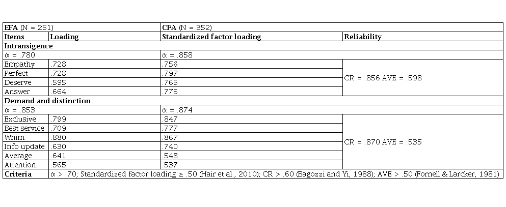 First, as per Netemeyer et al. (2003) recommendation, the dimensionality of the extended CEI was specified a priori, and the scale was expected to have three dimensions, as in Butori (2010). The first dimension (demand) captures the idea of high service quality expectations. The second dimension (intransigence) captures the idea of high expectations in a service failure context. The third dimension (distinction) captures the idea of special treatment, such as the expectation of extra recognition, better service, additional efforts, and rewards for a limited number of customers. Items that correspond with Butori’s (2010) three-dimensional CEI structure were selected from literature review and presented in Table 2. Some items appear with certain codes, such as “Know,” “Whim,” etc., as in Boyd and Helms (2005) and Butori (2010) original studies. Since the study was conducted in Vietnam, so the original items, which are presented in English, were back-translated into Vietnamese by a professional translator to ensure linguistic equivalence, clarity, and reliability (Brislin, 1986).