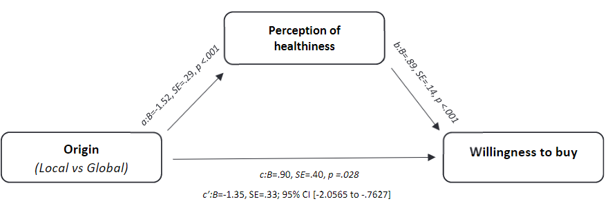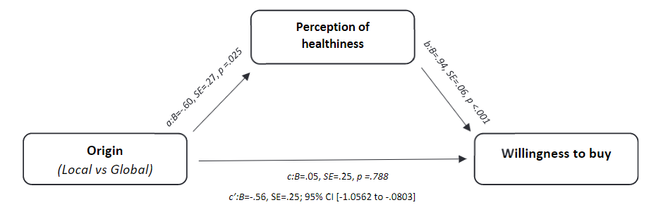 Next, the impact of perception of healthiness on willingness to buy was investigated. A mediation analysis (Hayes, 2017; PROCESS; Model 4, 5000 boot-strapped samples) with origin as the independent variable (dummy coded, 0 = local; 1 = global), perception of healthiness as the mediator, and willingness to buy as the dependent variable shows that, corroborating the analysis above, the global origin cues decrease perception of healthiness as compared to the local origin cue (B = -.60, SE = .27, t(145) = -2.26, p = .025). In turn, perception of healthiness increases willingness to buy a product (B = .94, SE = .06, t(144) = 15.38,p < .001). Importantly, to assess whether the impact of origin on buying intentions is mediated by perception of healthiness, the indirect effects were assessed. The analysis shows that the impact of origin on buying intentions was indeed mediated by perception of healthiness as the 95% confidence interval did not include zero (effect = -.56, 95% CI [-1.0562 to -.0803]) (see Figure 2). The direct effect of the origin (local versus global) to purchase intention was non-significant (p = .788). Thus, perception of healthiness fully mediates the relationship between the origin and willingness to buy. In support of H2, the results show that global (vs. local) positioning decreases perception of healthiness and, in turn, impacts willingness to buy.