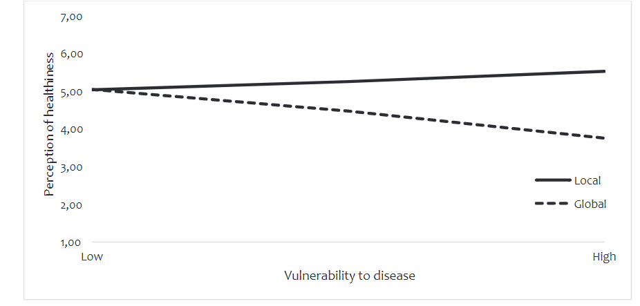 H3: Vulnerability to disease moderates the impact of origin (global versus local) positioning on consumers’ perception of healthiness, such that high vulnerability to disease decreases consumers’ perception of healthiness of food products with global (versus local) origin positioning and differences in perception of healthiness vanish when consumers score low on vulnerability to disease.