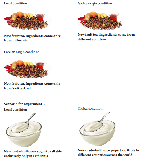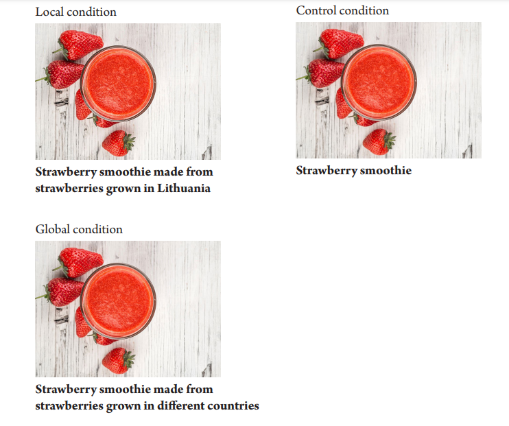Method and measures. Data were collected in a lab of a business school in Lithuania. Ninety-three participants from a professional research agency panel (Mage = 37.71 years, 66.7% female) participated in the experiment in exchange for bonus points. The experiment was conducted in three different between-subject experimental conditions where the origin of the fictitious product was manipulated. The local condition (1) included a descriptive story about a new product – fruit tea made only from domestic fruit, and the foreign condition (2) had a descriptive story about a new fruit tea made from fruit originating only from Switzerland. In the global condition (3), the fruit came from different countries across the world. Measurement of perceptions of healthiness (Cronbach’s α = .92; M = 4.74; SD = 1.40) and willingness to buy (Cronbach’s α = .90; M = 3.89; SD = 1.77) was used identically to Experiment 1.