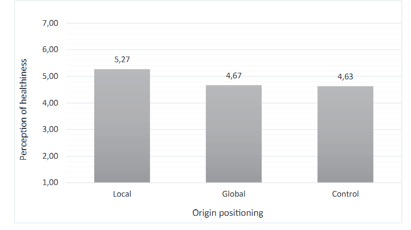Results. To assess whether the manipulation of origin was successful, participants were asked to evaluate the likelihood that the product was made from ingredients originating from multiple different countries (as a globalness cue). The results showed that the manipulation was successful. Participants evaluated that it was more likely that the strawberries came from various countries in the global condition (Mglobal = 5.65, SDglobal = 1.48) than the local (Mlocal = 3.76, SDlocal = 1.99, t(145) = 6.56, p < .001) or control (Mcontrol = 4.93, SDcontrol = 1.77, t(148) = 2.71, p = .008). A one-way ANOVA showed that perception of healthiness of food product varied across the conditions (Mlocal = 5.27, SDlocal = 1.48; Mglobal = 4.67, SDglobal = 1.74; Mcontrol = 4.63, SDcontrol = 1.90, F(2,219) = 3.20, p = .043) (see Figure 1). In support of H1, participants perceived the strawberry smoothie with a global positioning as less healthy compared to the strawberry smoothie with local (Mlocal = 5.27; SDlocal = 1.48 vs Mglobal = 4.67; SDglobal = 1.74; t(145) = 2.26, p = .025) and control (Mcontrol = 4.63; SDcontrol = 1.90; t(145) = 2.28, p = .024) settings. Meanwhile, the differences between global origin and control conditions are non-significant (t(148) = .13, p = .893, NS).