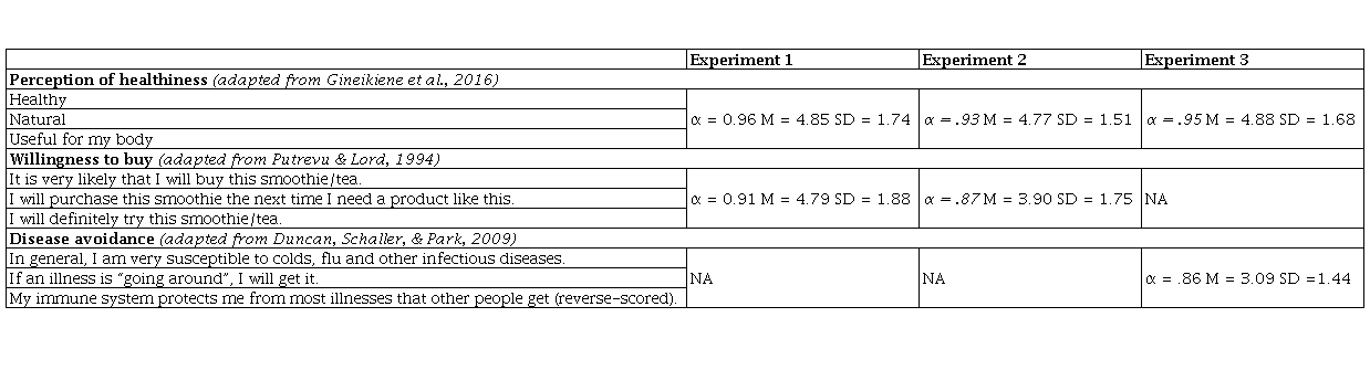 The research methodology consists of three experimental research design studies. Experiments manipulate the origin with three different types of food products (smoothie, fruit tea, and yogurt). Experiment 1 seeks to establish the main effect of origin (global versus local) cue on perceptions of healthiness by manipulating the origin with the descriptive story and neutral picture of the fictitious product. Moreover, Experiment 1 shows the mediation effect of healthiness between the origin and buying intentions (H2). Experiment 2 replicates the findings of Experiment 1 with another type of product (fruit tea). In addition, the experiment introduced foreign origin conditions to provide empirical evidence that global origin conceptually differs from the foreign origin in healthiness evaluations. Further, Experiment 3 looks more deeply into the healthiness bias phenomenon and shows that disease avoidance works as a moderator between origin and perception of healthiness (H3). Power analysis was performed using G*Power (Faul et al., 2009) to determine the sample size for all experiments. A medium to large effect size was expected, based on the effect size reported in the previous research on the impact of country of origin on perception of healthiness (Gineikiene et al., 2016). The analysis yielded a minimum sample size of . = 64 for Experiment 1 and Experiment 2, and . = 52 for Experiment 3, using 80% power and an α-error probability of .05 (Luttrell, Petty & Xu, 2017). The actual sample size for all experiments well exceeded this minimum.