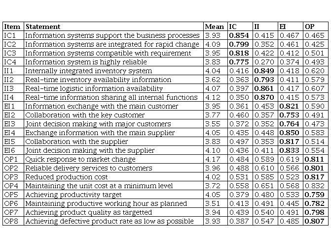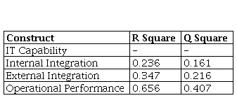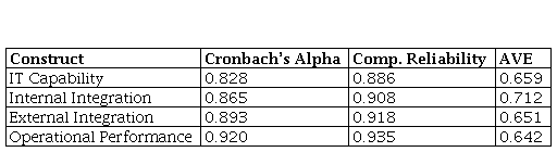 Table 2 presents the results of the indicators validity test. Since the value of outer loading (written in bold) is greater than 0.50 in all cases, those indicators are valid in terms of convergent validity. Furthermore, the values written not in bold are less than the outer loading value of each corresponding indicator, which means indicators are valid. The minimum value on the IT capability indicator is 0.755, corresponding to the IC4 indicator. Internal integration has the lowest value of 0.793 on indicator II2, external integration with a value of 0.753 on the EI2 indicator, and operational performance with a value of 0.759 on the OP5 indicator. Another measurement of the convergent validity is the average variance extracted (AVE), which indicates the average percentage of variation explained among the construct item. The recommended value of AVE is greater than 0.50 (Fornell & Larcker, 1981). Table 3 demonstrates the AVE calculation, and the result is greater than 0.50, which satisfies the requirement. Based on these two findings, all indicators are valid with convergent and discriminant validity.