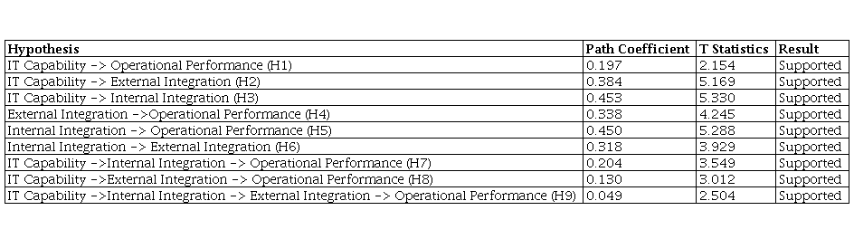 As previously defined, this study examines the effect of IT capability on operational performance through internal integration and external integration. Based on previous research, this study has proposed nine hypotheses as theoretical-based responses to the research questions. The conclusion of the study can be drawn as follows. IT capability directly improves operational performance (H1). IT capability influences internal integration (H2). IT capability influences external integration (H3). External integration influences operational performance (H4). Internal integration improves operational performance (H5). Internal integration affects eternal integration. The exciting finding of this study is the existence of mediating role of external integration and internal integration. IT capability indirectly improves operational performance through external integration (H7). Besides, IT capability enhances operational performance through internal integration (H8). IT capability indirectly affects operational performance through external integration and internal integration (H9). These results imply that ITT capability has multiple effects on operational performance.