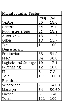 Moreover, Table 1 demonstrates the composition of the respondents based on the department they are in charge of. All respondents work in the department related to logistics, operation, production control, and purchasing. This composition indicates that respondents are related and knowledgeable on the constructs of this study. This finding shows that respondents are in charge of most of the company operational activities at the management level. Therefore, they are considered knowledgeable in the daily manufacturing operation activities. In addition, respondent profile by position represents the level of management such as supervisor, manager, and owner of the company. This finding shows that the respondents recognize the company strategy and activities, which means that the responses given are considered precise and relevant.
