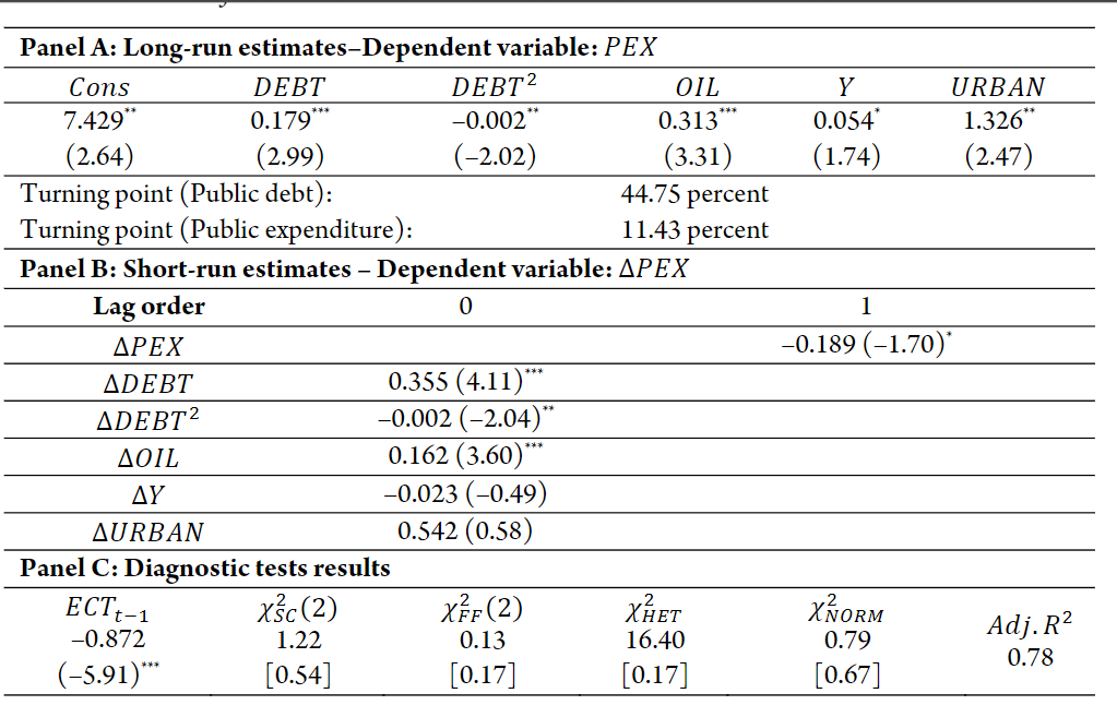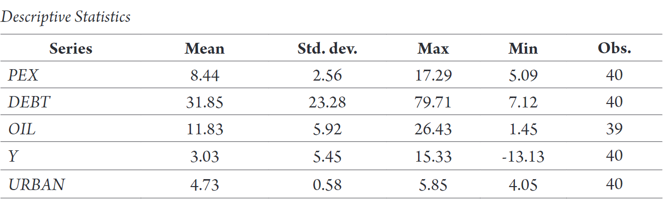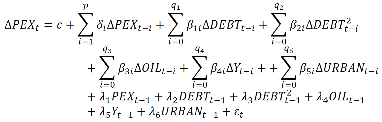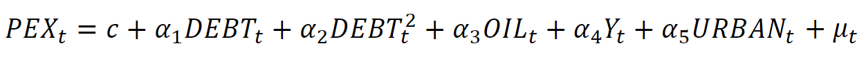 Therefore, a simple model in which public expenditure (PEX) is dependent on public debt (DEBT), its quadratic term (DEBT2), alongside oil rents (OIL), real output growth rate (Y), and the rate of urbanisation (URBAN) is specified as follows: