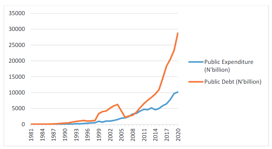 Like in most countries, public debt stock has been on the increase in Nigeria since she gained independence from the British due in part to the growing size of the country’s population, increased participation of the government in the economy and, most importantly, the dwindling oil revenue which accounts for over 70 percent of the government’s income (Central Bank of Nigeria [CBN], 2020). Available statistics demonstrates that Nigeria’s public debt stock maintained an expansionary stance between 1981 and 2020, except in 2006, when the country’s debt stock declined significantly by about 47.77 percent, following the implementation of the Paris Club debt relief (CBN, 2020). However, the sustained increase in public debt saw Nigeria emerging as the most indebted country in West Africa, and second in Sub-Saharan Africa, only behind South Africa (World Bank, 2021). In the same vein, Nigeria’s public expenditure has remained relatively high (Aladejare, 2019; CBN, 2020).