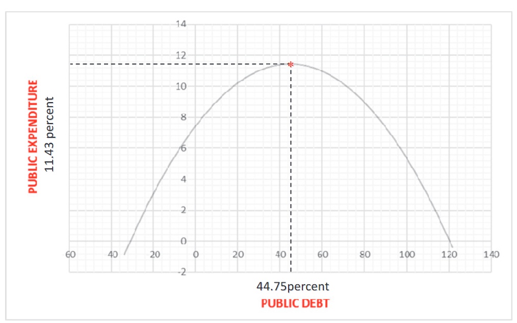 Note The model is estimated by setting the maximum lag to 4, and the optimum lag-length is suggested by AIC. ∆is the first difference operator. Asterisks (***), (**) and (*) denote significance at 1%, 5%, and 10% respectively. Values in parentheses (.) in panel A and B are the t-ratio, and values in square parentheses [.] in panel C are the probability values of the LM test statistics. Importar imagen denote the Breusch-Godfrey serial correlation, Breusch-Pagan-Godfrey heteroscedasticity, Jarque-Bera normality and Ramsey RESET functional form LM tests, respectively.Moreover, the findings suggest that public expenditure and public debt relationship in Nigeria has an inverted U-shaped feature. Based on the quadratic specification in Equation 1, the estimated turning points/threshold of public debt and public expenditure are 44.75 percent and 11.43 percent, respectively. A graphical representation of the quadratic function is provided in Figure 2. The plots illustrate the increase in public expenditure following an increase in public debt prior to its threshold of 11.43 percent. However, over and above this threshold, further expansion in public debt (as a percentage of the GDP) leads to diminution in public expenditure (as a share of GDP).