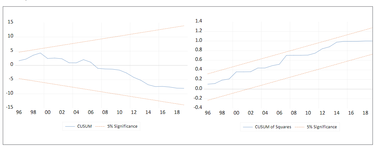 The results of the diagnostic tests presented in panel C of Table 4 demonstrate that the ARDL model is free from the issues of serial-correlation, misspecification error or bias, heteroscedasticity and normality. More so, the cumulative sum of recursive residuals (CUSUM) and cumulative sum of squares of recursive residuals (CUSUMQ) plots of Brown, Durbin and Evans (1975) presented in Figure 3 and Figure 4 indicate the stability of the parameters in the long term, and hence the suitability of the empirical outcome for policy making.