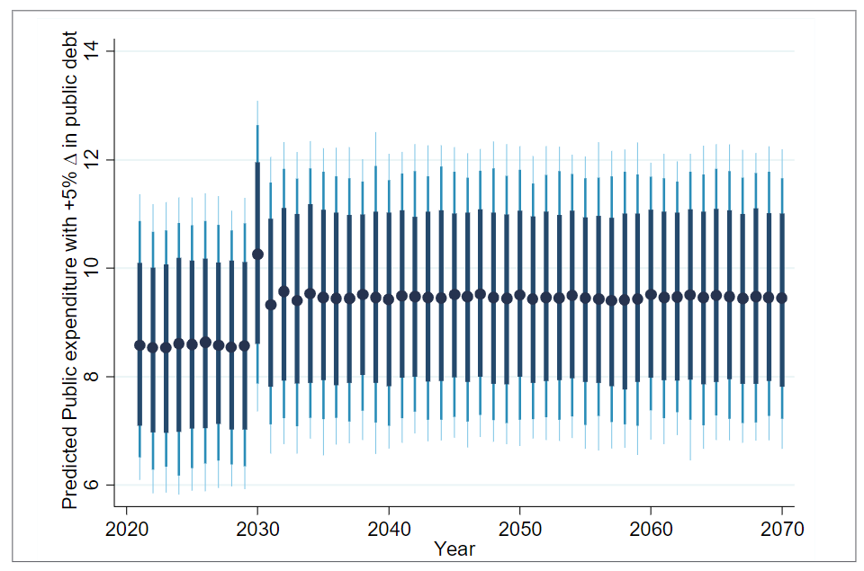 Note. The forecasting is executed using the Dynamic ARDL Simulations. The counterfactual shock in predicted public expenditure is achieved based on 5,000 simulations. Black dots show average predicted value, while shaded lines (from darkest to lightest) show the 75, 90, and 95 percentiles of the predictions from the simulations akin to a credible interval or confidence interval.