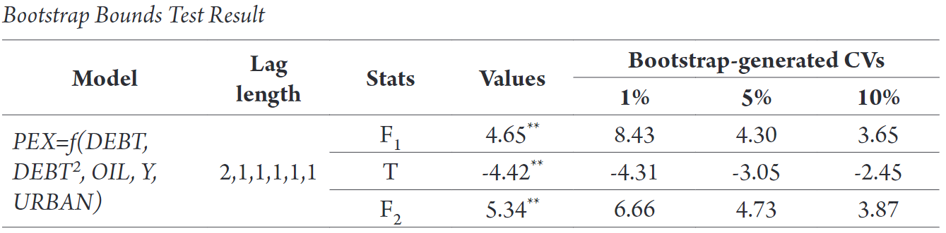 The results of the tests summarised in Table 2 present mixed outcomes. However, the test statistics generally confirm that OIL, Y and URBAN are stationary at level (i.e., they have no unit root), while PE X, and DEBT are only stationary after taking their first difference. Thus, the results demonstrate that the variables are a mixture of I(0) and I(1). Since the bounds-testing procedure allows for series to have different orders of integration (at least not greater than order one – I(1)), these findings provide the justification for adopting the bootstrap ARDL bounds-testing approach (Pradhan & Hiremath, 2020; Pradhan et al., 2021).