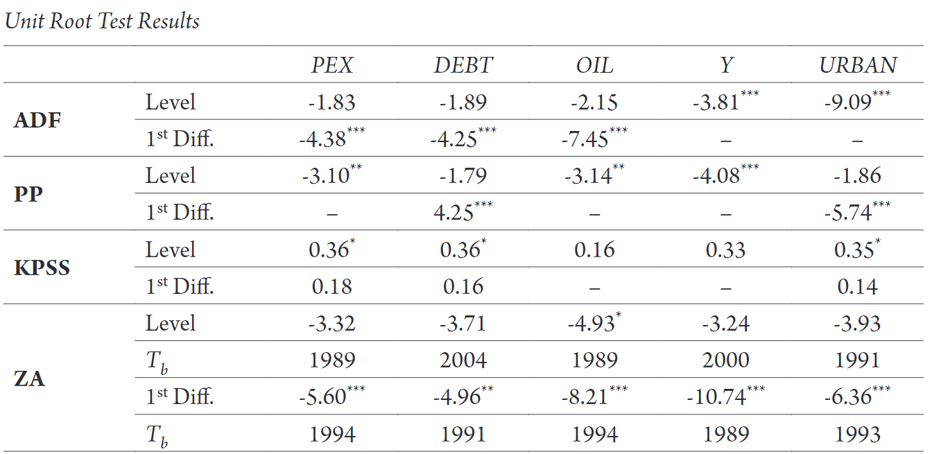 PEX, DEBT, OIL, Y and URBAN denote public expenditure, public debt, oil rents, real output growth, and urbanisation, respectively.Prior to modelling the relationship between the variables, unit root test was conducted to ascertain the stationarity property of the variables. The traditional Augmented Dickey-Fuller (ADF), Philips-Perron (PP), and Kwiatkowski-Phillips-Schmidt-Shin (KPSS) unit root tests, alongside the Zivot-Andrews (ZA) test of Zivot and Andrews (1992) are employed for this purpose. Since ZA test explicitly accounts for the possibility of structural break in series, the test is adopted as a complement to the conventional tests which are weak in the presence of structural breaks.