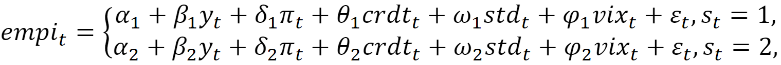 The model presented in Equation (2) in a linear form can be re-written with the two regime MSIAH model: