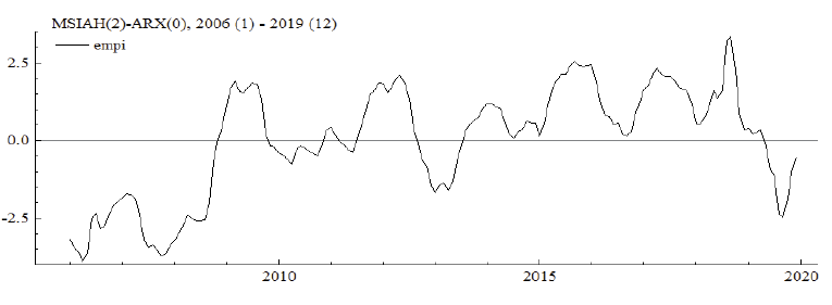 Many studies have demonstrated the time-varying relationship between exchange rates and macroeconomic fundamentals (Frömmel et al., 2005; Junttila & Korhonen, 2011; Yuan 2011; Wu, 2015; Beckmann et al., 2018). MS models define different states of regimes and allow us to analyze the asymmetric behaviors of variables conditional on the regimes (Baharumshah et al., 2017). Kumah (2011) showed that MS models can help to understand the factors affecting low and high foreign exchange market pressures. Therefore, we investigate the determinants of EMP by employing the Markov Regime Switching Intercept Autoregressive Heteroscedasticity (MSIAH) model.