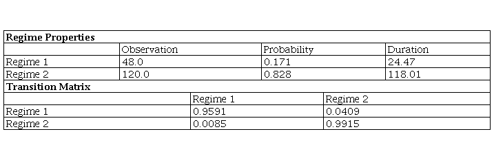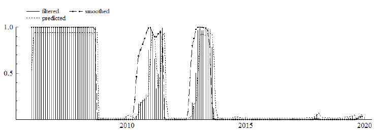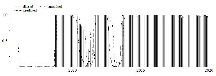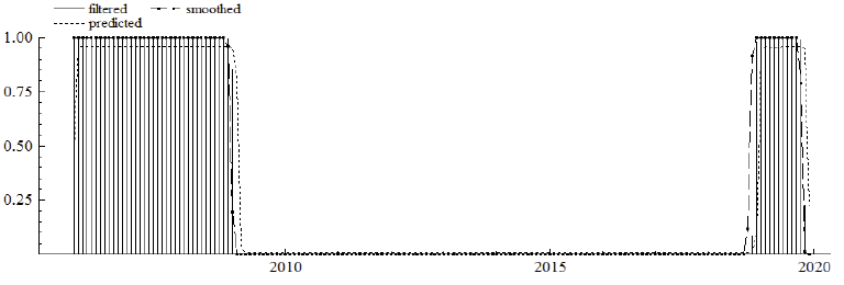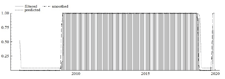 The MS model is estimated by the maximum likelihood estimator based on the expectation-maximization (EM) algorithm. According to this algorithm, the observed variables are bound up with unobservable stochastic variables. The EM algorithm iteration has two steps: expectation and maximization, respectively. The first step is based on the filtering and smoothing algorithms employing an estimated parameter instead of the unknown true parameter. In this way, smoothed probabilities can be estimated from the unobserved states. In the second step, the estimated parameter is obtained by using the first-order conditions linked with the likelihood function to substitute conditional regime probabilities with smoothed probabilities. The new parameter of the smoothed and filtered probabilities is updated in the following expectation step. Thus, each step raises the likelihood value5 (Krolzig, 1998).