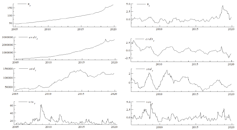 (2)where ytindicates the industrial production index, which is the proxy for domestic income; inftreflects the consumer price index; crdtt denotes the total credit volume of the banking sector; stdt represents the short-term external debt stock; and vixt shows the volatility index. The daily frequency of VIX is converted into monthly frequency based on the last observation in that month. While α denotes the constant term, εt indicates the error term. The series showing a seasonal effect are seasonally adjusted employing the Census X-13 method. All explanatory variables are used as annual percentage changes and standardized to eliminate level differences between the series.