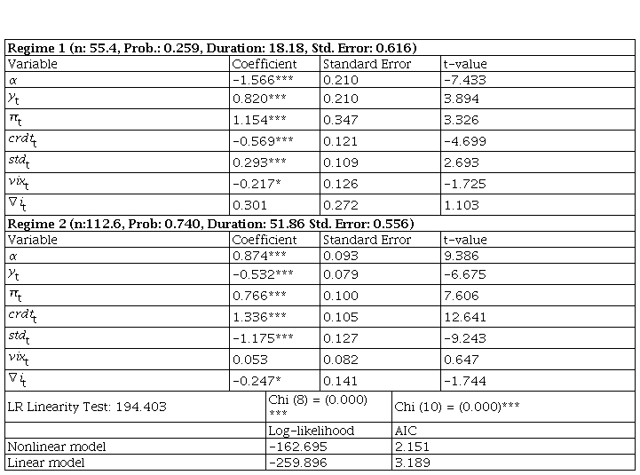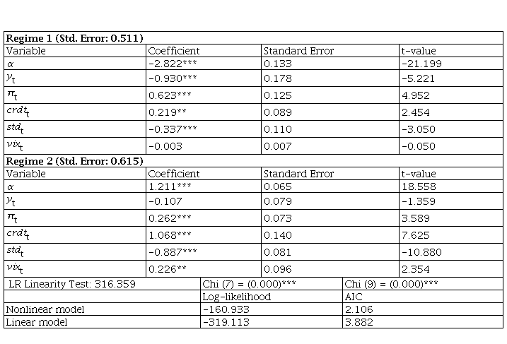 Before proceeding to the estimation results regarding the determinants of EMP, it is necessary to review the findings of the linearity test. The validity of the linear model was analyzed with the likelihood ratio (LR) linearity test, which shows that the linear model is not valid. Furthermore, the comparison of the Akaike information criterion (AIC) and log-likelihood values of the nonlinear and linear models confirms the two-regime MSIAH model (Çatık & Önder, 2011; Baharumshah et al., 2017).