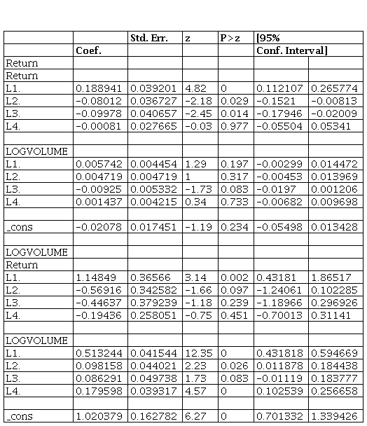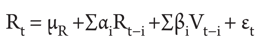 The following bivariate VAR model is applied using OLS method to measure the direction of relationship between market returns and trading volume (Akpansung & Gidigbi, 2015):
