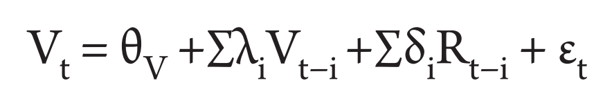 (4)where Rt and Vt represent market returns and trading volume, respectively. The parameters αi and βI in model (3) represent the impact of previous returns and previous volume, respectively, on current returns. If βI ≠ 0, then we can assume that volume causes returns. If both parameters are statistically significant, it is concluded that past trading volume together with previous returns can provide better estimation for the current returns. The same applies to model (4), which defines the impact of the previous volume and returns on the current volume.