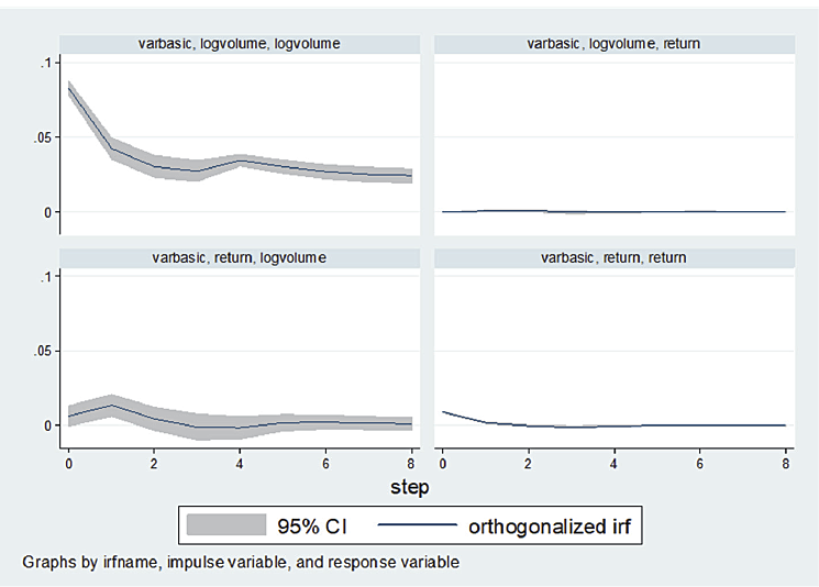 Figure 2 represents the impulse response function (IRF) to define the direction of relationship between trading volume and market return. The results of the IRF test support the findings of the VAR and the Granger causality tests. Market returns do not respond to changes in the trading volume. Similar results are obtained in the response of market return to its own values in the long term. In the short term, the return is negatively affected by its own shocks. The results are mixed in the response of volume to its own values and in the response of volume to returns.