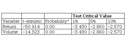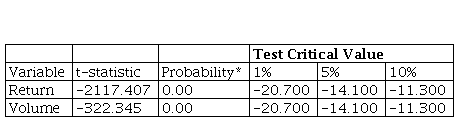 The results of the unit root test in Tables 1 and 2 reveal that both variables, market returns and trading volume, are stationary. The test statistic values in the Dickey-Fuller and the Phillips-Perron tests are above the critical values at 1%, 5% and 10% level.