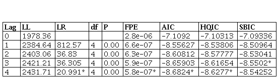 The stationarity of variables under study allows applying the VAR model, but this requires a pre-estimation of the number of lags. The results of AIC and HQIC in Table 3 show that the optimal number of lags is four.