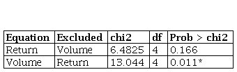 Vector Autoregression model (VAR) defines the direction of the relationship between trading volume and market return (see Table 4).