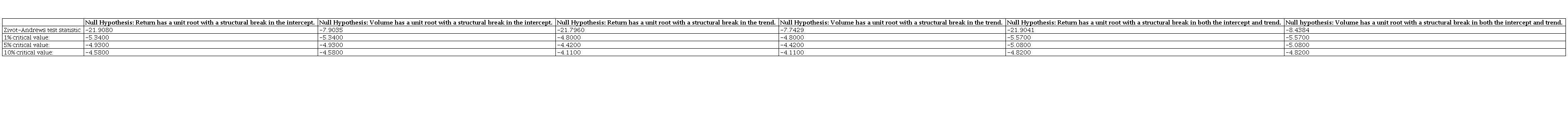 The analysis is extended to determine the direction of the relationship between the two variables. The Granger causality test, developed by Granger (1969), is carried out to define whether return causes volume, volume causes return, or either variable causes the other. A number of diagnostic tests are applied to assure that error terms are free from heteroscedasticity and serial correlation. The Breusch-Pagan test is applied to check for the presence of heteroscedasticity, and the Breusch-Godfrey test to check for serial correlation. The Zivot-Andrew (1992) test analyzes whether the time series data under study have any structural breaks.