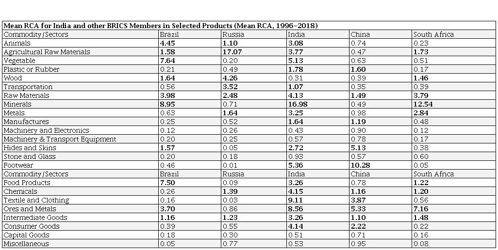 The higher the RCA value of wood for Russia shows that it is relatively more competitive in this field than Brazil and South Africa. With an index value of (3.52), Russia stands as a sole competitor to India in transportation. In raw materials and intermediate goods, the RCA values of all BRICS countries are greater than one, indicating a competitive relationship among the BRICS countries. The RCA values of Brazil, India, and South Africa in the case of minerals are far larger than one. In the export of metals, Russia and South Africa are the two major competitors to India. India could become the largest exporter of manufacturers as its RCA value is above one, and only China stands as a competitor to India in manufacturer exports. All BRICS countries have a comparative disadvantage in exports of machinery and electronics, machinery and transport equipment, stone and glass, capital goods, and miscellaneous products. Therefore, there seems no scope in expanding trade among BRICS nations in these product lines.