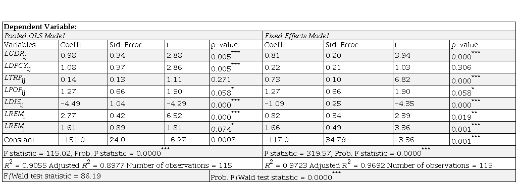 Since, in the present study, “the number of time observations is greater than the number of cross-sectional units, there is likely to be little difference in the values of the parameters estimated by FEM and REM” (Gujarati, 2015; Judge et al., 1985). The choice then depends on computational ease and convenience, which in our case, favors FEM. Since the observation units in our panel data set are members of the BRICS bloc, these countries certainly cannot be considered to represent a random sample of the 200-odd sovereign nations in the world. We should, therefore, employ FEM rather than REM even though this can entail a loss of efficiency (Dougherly, 2011). Moreover, in theory, in the case of balanced panel data sets, FEM is preferred, whereas, in the case of unbalanced panel data sets, REM is more appropriate. Thus, we used the panel OLS and fixed effects models to analyze the India–BRICS trade flows15. The choice between the pooled OLS model and the FEM model is made based on the F-test. Under the null hypothesis, the efficient estimator is pooled least squares; the F-ratio used for this test is