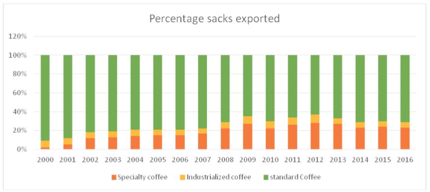 Since 2004, the Federation, along with different entities involved in the governance of the indication, has developed technical studies to analyse the feasibility of registering regional coffees, such as those coming from Nariño, Cauca, Huila, Tolima, Santander, Norte de Santander, Cesar, La Guajira and Magdalena (Hincapié, Elías, Suárez, Henao & Arboleda, 2013). Currently, Café de Nariño, Café de Huila, Café de Santamder, Café de la Sierra Nevada, Café de Tolima and Café del Cauca indications have been registered (Federación Nacional de Cafeteros de Colombia, 2020). These specialty coffees (including the ones with geographical indications) have allowed small growers to obtain a better price for the bean and replace part of the production of traditional coffee, depending on the commodity price, with specialty coffee (Figure 2).