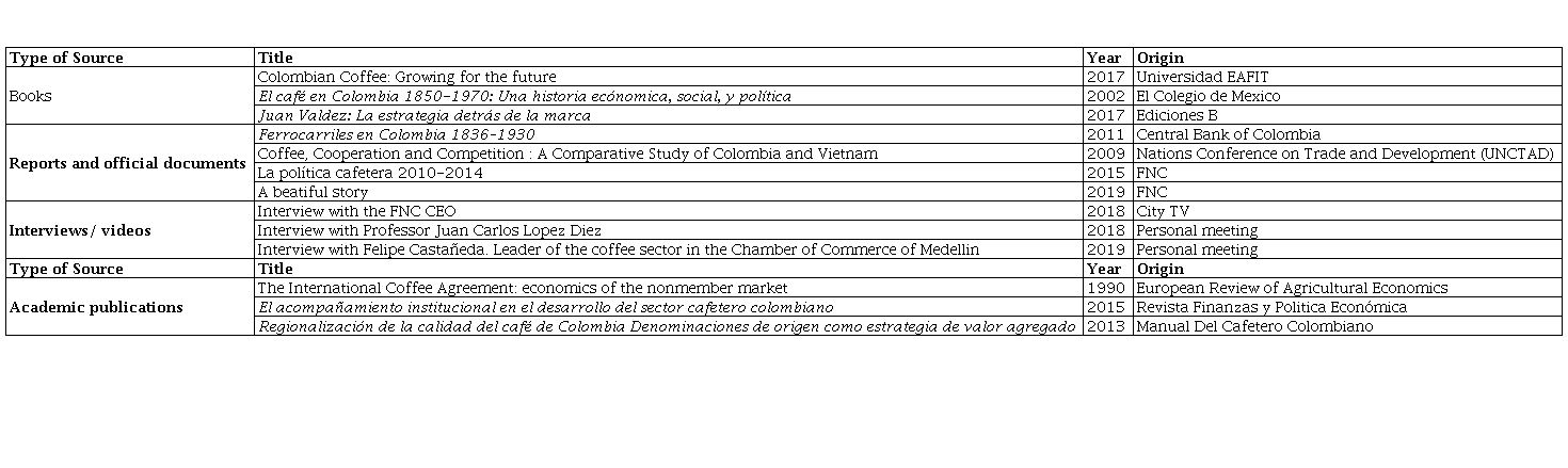 Secondary sources of information, such as historical documents, official reports, books, videos and interviews conducted with former executives of the FNC, were used to develop the case study. Different sources of information are included to enhance the validity of the data. The sources used are described in Table 1.