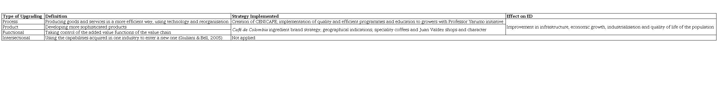 Furthermore, Colombian policy makers should use the coffee case to promote policies that give incentive to industries dependent on natural resources to use upgrade strategies, especially in distant and poorly industrialised regions.