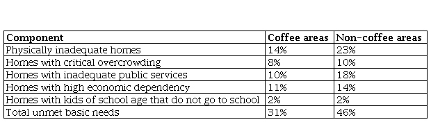 The investment from the FNC, public and private entities and the relatively high income of the population in the coffee areas has elevated the quality of life of the population in this zone, compared with other areas of the country. Table 5 presents unmet needs in terms of housing, public services, economic dependency and education access of coffee and non-coffee regions in Colombia.