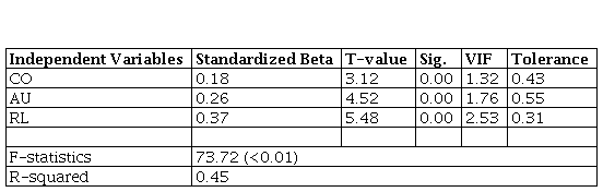 The results of regressions analysis were summarized in Table 2. The F-statistics obtained was 73.72 (sig.<0.01), which indicated that the model was statistically fit. The R-squared value was 0.45, which indicated that 45% of the motivation to adopt e-commerce was explained by CO, AU and RL. The rest 55% could be explained by other variables. The highest standardized beta value was recorded by RL (β=0.37; sig.<0.01), followed by AU (β=0.26; sig.<0.01) and CO (β=0.18; sig.<0.01). This showed that RL was the most important factor in influencing MEC, followed by AU and CO. The results further depicted that all three hypotheses (H1-H3) were supported.