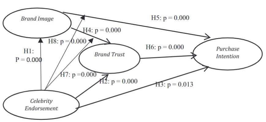 The effect of brand image on brand trust is regarded as one of the most important relationships in building a strong brand (Esch et al., 2006). The authors suggest that without a strong brand image, a brand will have no relationship with a customer. Alfanda et al. (2018) maintain that this relationship is made more powerful through the use of CE. Dib and Johnson (2019) point out that when a customer views a celebrity image, he/she transfers it to the brand the celebrity is endorsing. That is, a customer no longer perceives the brand as ordinary; instead, the brand now serves as a tool to bring the customer one step closer to their idolized celebrity. For example, a basketball enthusiast customer feels that his/her performance improves by wearing a pair of Air Jordan, or a customer who wears something from the Love Bravery clothing line feels that he/she has a similar fashion sense to Lady Gaga. Accordingly, a customer feels that a brand improves their personal and social identity (Arsena et al., 2014). Over time, such positive experiences improve a customer’s confidence, trust in the brand, and ultimately encourage purchase intention. Thus, this study hypothesizes that: