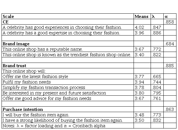 All the scales adopted in this study were borrowed and adjusted from the published literature. These scales used five-point Likert-type scales anchored at extremely disagree to extremely agree. Two CE scales were borrowed from Ohanian (1990), two original brand image items were adopted from Aaker (1996), five brand trust items were modified from Delgado-Ballester and Munuera-Aleman (2000), and two purchase intention scales were transformed from Moon et al. (2008). To ensure the accuracy of the adopted items, this study followed McGorry’s (2000) double translation procedures. The questionnaire was first translated into Indonesian by a professional translator, then the Indonesian version was re-translated to English by one of the authors.