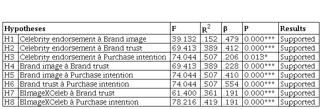 Finally, the present study also confirmed the moderating effect of CE. The findings showed that CE affects the relationship between brand image and trust (β = .191 p = .000) as well as the relationship between brand image and purchase intention. This means that CE is responsible for determining how strongly brand image affects brand trust and purchase intention (β = .191 p = .000). The rationale behind these findings can be explained by Plummer’s (1985) brand personality theory. According to Plummer (1985), each brand has a different personality. That is, a brand has emotional characteristics that make it unique and allow it to connect to its customers. However, identifying a brand’s personality is challenging, and it is possible that a customer will fail to understand the brand’s image and therefore develop less attachment to the brand. CE of a brand is likely to help a customer identify with a brand’s image as the characteristics and image of the celebrity transfer to the brand, making it easier for the customer to identify with the brand. Thus, when a customer thinks about a brand, he/she is likely to think about the celebrity who endorses it and vice versa. Because of this, CE plays a crucial role in creating a strong brand image, which further leads to brand trust and purchase intention. Accordingly, it is crucial for fashion brands to employ celebrities who display similar characteristics to the fashion brand. The findings support the studies of Dib and Johnson (2019), who also found that CE has moderating effects in different contexts. Thus, H7 and H8 were accepted. Table 2 presents an overview of the hypotheses results.