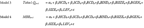 Meanwhile, research problem (RQ2) in this study can be reflected in hypotheses 3a, 3b, 3c, 4a, 4b, 4c, 7a, 7b, 7c, 8a, 8b, 8c, which focus on market-based performance measured with Tobin’s Q and MBR. To answer RQ2, it used Model 3 and Model 4, which can be stated as follows: