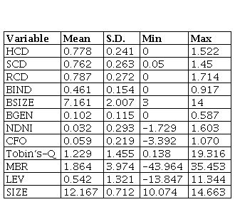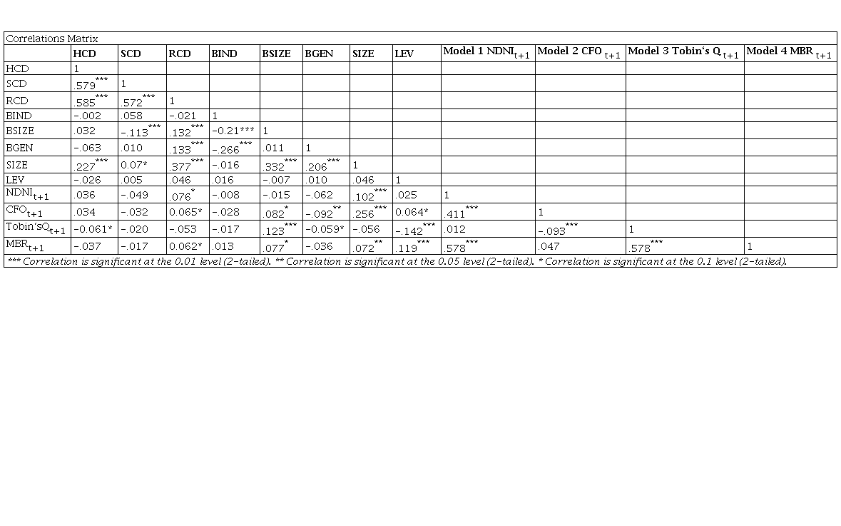 Table 8 shows the mean, standard deviation, minimum, and maximum-values of the variables used in this study. HCD results show a mean value of 0.778 and standard deviation value of 0.241, which means that most of the companies disclosed in a narrative form. The highest HCD is 1.522 owned by MTDL (IDX) and the lowest is 0 owned by HANA (SET). On the other side, SCD results show a mean and standard deviation value of 0.762 and 0.263. It means that SCD was mostly disclosed in a narrative form. The highest SCD is 1.45 owned by THCOM (SET) and EXCL (IDX) in 2015, while the lowest is 0.05 owned by the HANA (SET) and IMP (PSE). RCD has a mean value of 0.787 and standard deviation value of 0.272. Just as HCD and SCD, it means that RCD was also mostly disclosed in a narrative form. The highest RCD is 1.714 owned by SAMART (SET) in 2014, while the lowest is 0 owned by HANA (SET). BIND in this study has a mean value of 0.461 and a standard deviation of 0.154. This shows that the average number of independent boards is 46.1% of all independent board members. The highest number of BIND was 0.917 owned by T39 (SGX) in 2012, while the lowest BIND was 0 owned by C76 (SGX) in 2011 and J03 (SGX) in 2011 - 2012. On the other hand, BSIZE in this study has a mean value of 7.161 and a standard deviation of 2.007. This means that the average number of boards owned by the sample companies is 7 people. The highest number of BSIZE was 14 owned by E16 (SGX) companies in 2011 - 2012 and INET (SET) companies in 2011, while the lowest BSIZE was 3 owned by 5BI (SGX) companies in 2017. The mean and standard deviation of BGEN in this study were 0.102 and 0.115, respectively. This indicates that the average proportion of women on board in the sample companies is 10.2%. The highest value of BGEN is 0.857 owned by TIMECOM (BM) companies in 2014, while the lowest value of BGEN is 0, which is dominated by Singapore and Malaysia state companies.